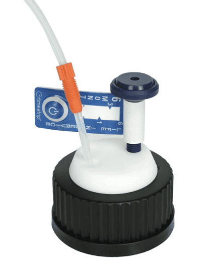 Port Safety Cap Deluxe Kit, GL45 Thread, Black Outer, ready-to-use with Air Inlet Valve and and 1/8" OD tubing adapter.